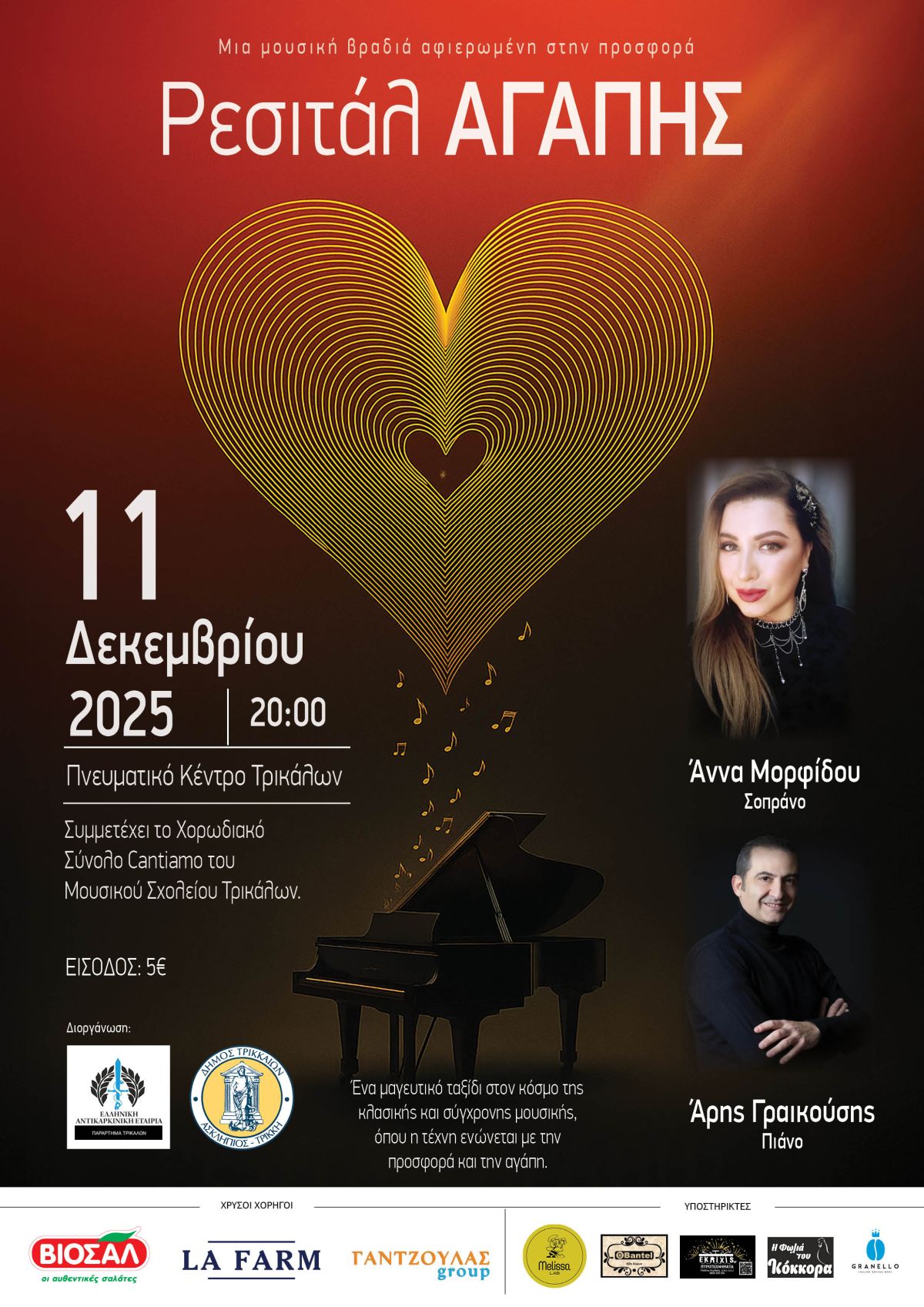 Η Αντικαρκινική Εταιρεία Παράρτημα Τρικάλων, σε συνεργασία με τον Δήμο Τρικκαίων, διοργανώνει μια ξεχωριστή φιλανθρωπική βραδιά με τίτλο «Ρεσιτάλ Αγάπης», όπου η μουσική συναντά την ανθρωπιά και η τέχνη ενώνει τις ψυχές. Στο επίκεντρο της εκδήλωσης βρίσκονται δύο διακεκριμένοι καλλιτέχνες: