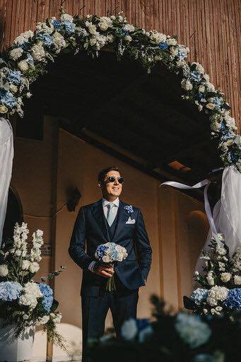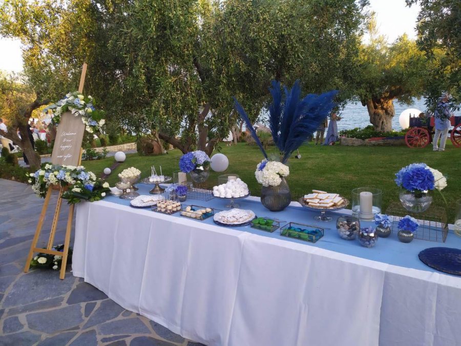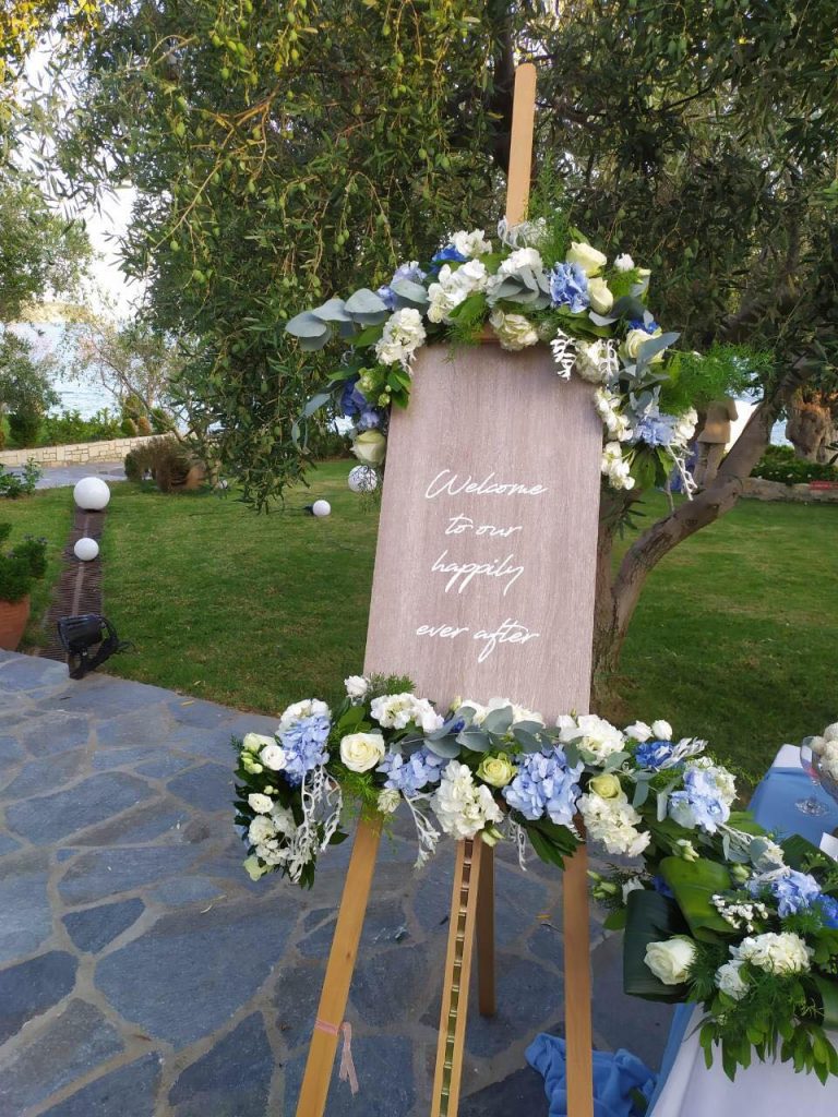 Ο ανθοδέτης Παναγιώτης Τζιβάνης επιμελήθηκε τις μπλε και λευκές ορτανσίες από Κίνα -Κενυα-Ολλανδία τόσο στο κτήμα όσο και στην εκκλησία.