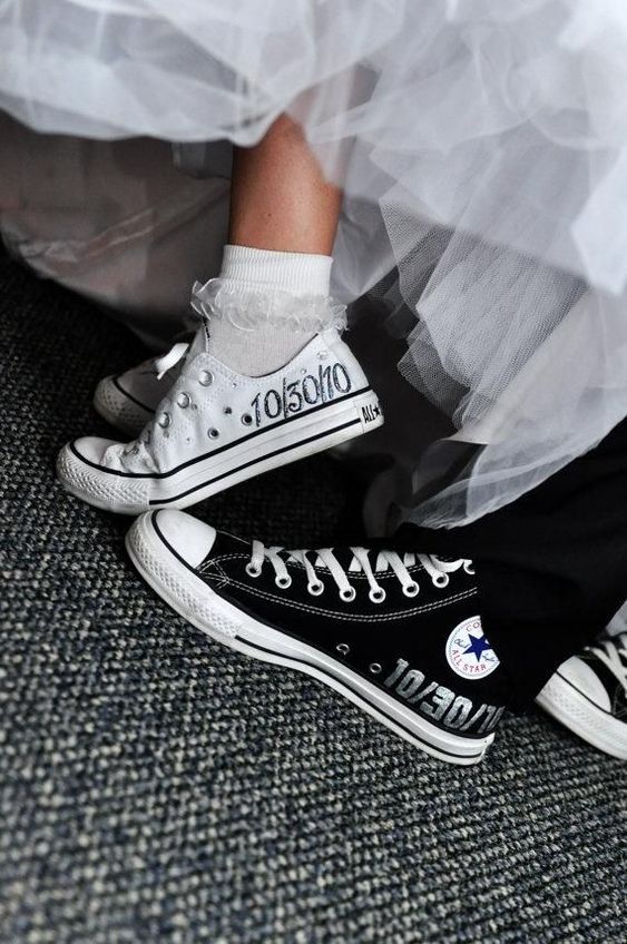 Τα παπούτσια All Star της εταιρίας Converse είναι πρώτα στην προτίμηση για τις εναλλακτικές νύφες. Λόγω της ποικιλίας των χρωμάτων τους, μπορούν να συνδυαστούν με τις χρωματικές λεπτομέρειες που έχετε επιλέξει για τη διακόσμηση. Αλλιώς ένα λευκό ζευγάρι All star διακοσμημένα με πέρλες, glitter και κορδέλες θα δώσει μια ξεχωριστή πινελιά στο στυλ σας. Επειδή τα All Star είναι unisex μπορείτε να κάνετε ένα ιδιαίτερο στυλ μαζί με τον γαμπρό γιατί μπορείτε κάλλιστα να φορέσετε το ίδιο ζευγάρι παπούτσια, κάτι που σίγουρα στις φωτογραφίες θα έχει ένα πολύ ξεχωριστό αποτέλεσμα .