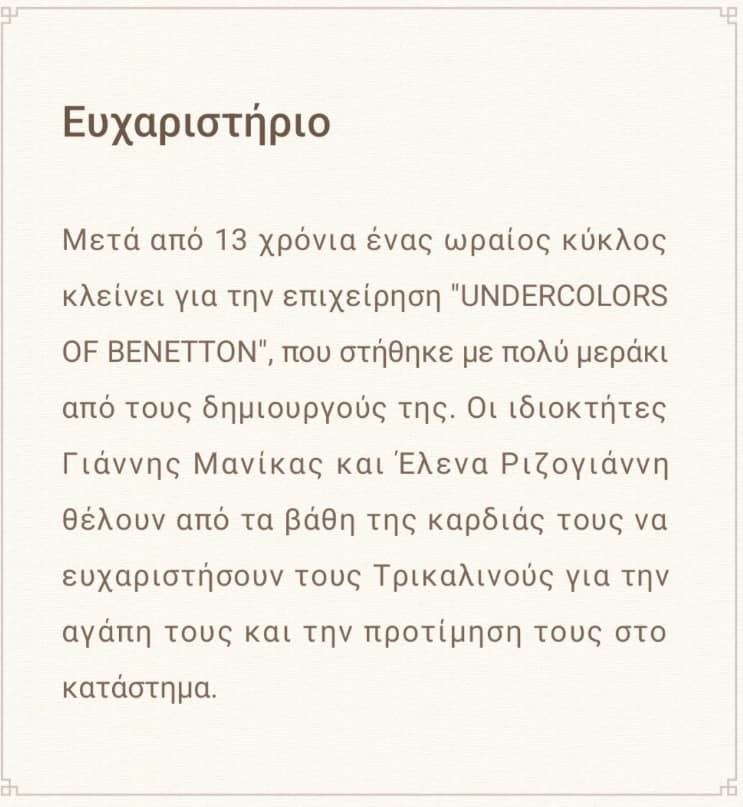 Mετά από 13 χρόνια κλείνει ένας κύκλος συνεργασίας με το Undercolors of Benetton Trikala στην Ιουλιέτας Αδάμ. Οι ιδιοκτήτες Γιάννης Μανίκας και Ελένη Ριζογιάννη, ανάρτησαν ένα ευχαριστήριο προς το καταναλωτικό κοινό και περιμένουμε την νέα τους επιχειρηματική κίνηση .