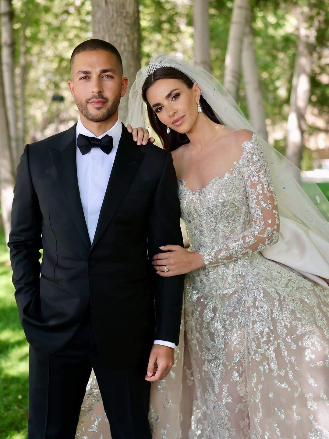Στις επίσημες φωτογραφίες που δόθηκαν στη δημοσιότητα το Σάββατο, το νιόπαντρο ζευγάρι εμφανίζεται λαμπερό και χαμογελαστό. Η νύφη μαγνήτισε όλα τα βλέμματα μέσα σε ένα custom – made νυφικό με δαντέλα και πέπλο που ανέμιζε αιθέρια. Ο Celio Saab επέλεξε ένα σκούρο κοστούμι με παπιγιόν, συνδυάζοντας διαχρονικό στιλ με σύγχρονη φινέτσα.