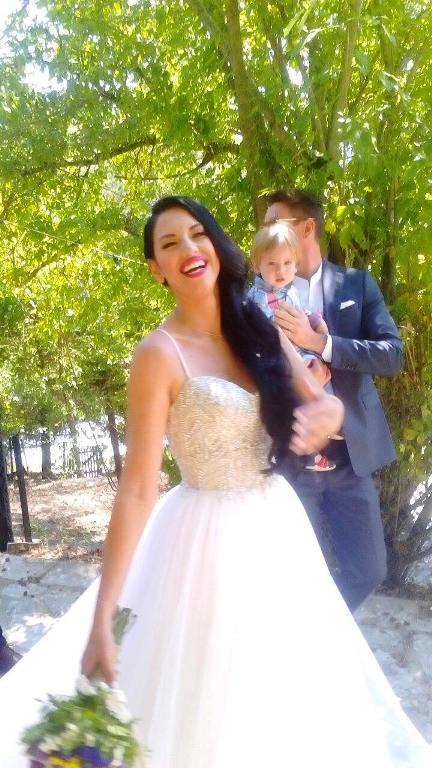 Το νυφικό ήταν παραμυθένιο με δαντελένιες λεπτομέρειες και η ανθοδέσμη της νύφης περιλάμβανε σομόν τριαντάφυλλα και μωβ κάλλες. Η νύφη είναι κόρη του παλιού ποδοσφαιριστή των Τρικάλων Σούλη Αναστασίου (αδερφός του πρώην αντιδημάρχου Τρικκαίων Χρήστο) , ο οποίος διέπρεψε ποδοσφαιρικά την δεκαετία του 80 στα Τρίκαλα και πλέον ασχολείται επιχειρηματικά στην Λάρισα δημιουργώντας μια μεγάλη αλυσίδα cafe.