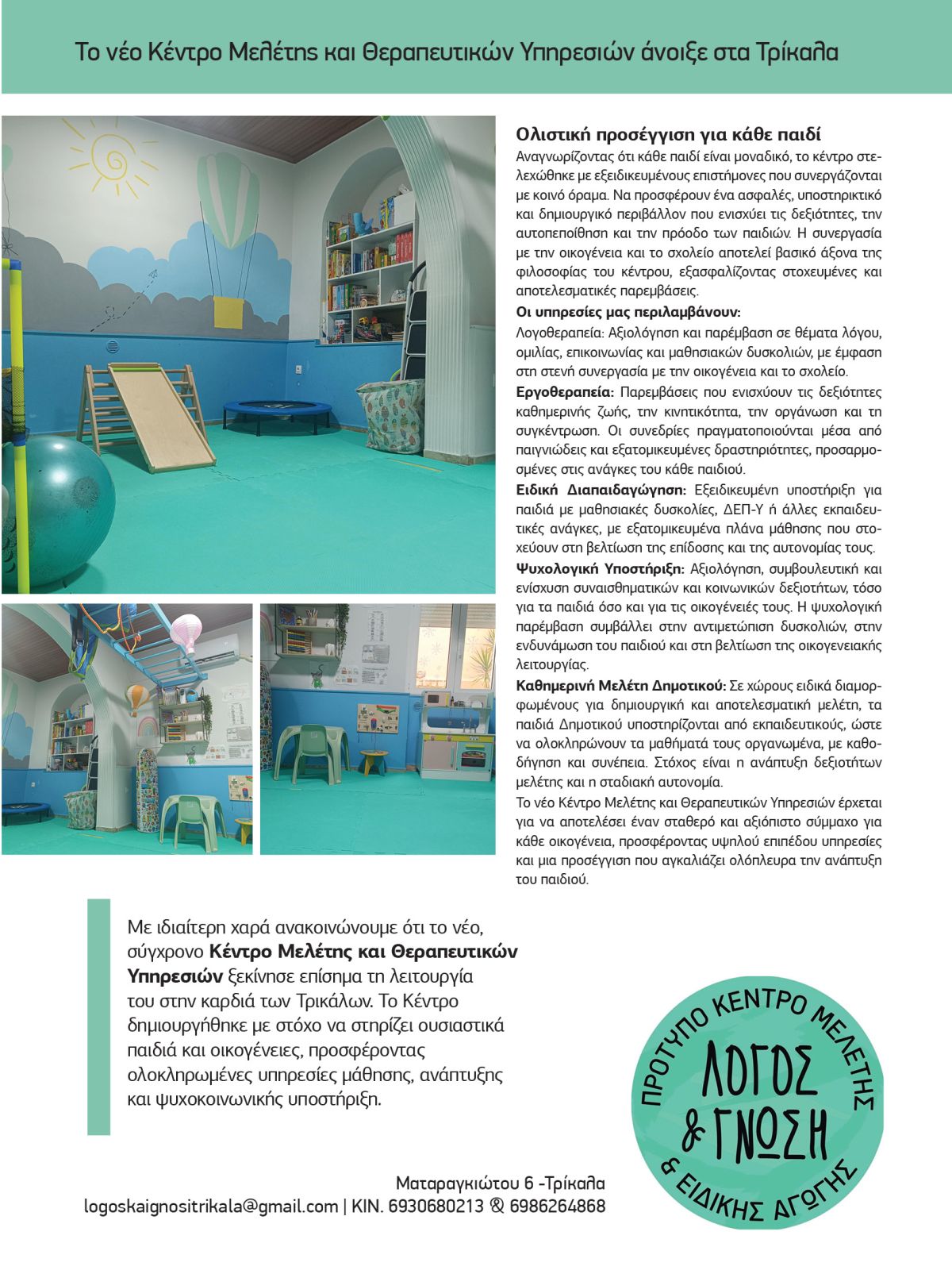Κέντρου Μελέτης και Θεραπευτικών Υπηρεσιών στην καρδιά των Τρικάλων το