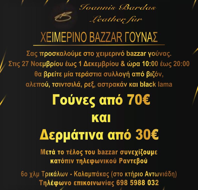 Σε ένα μοναδικό μπαζάρ γούνας και δερμάτινου προχωράει η οικογένεια Μπάρδα στα Τρίκαλα. Βρίσκουμε γούνες από 70 € και δερμάτινα από 30 €.