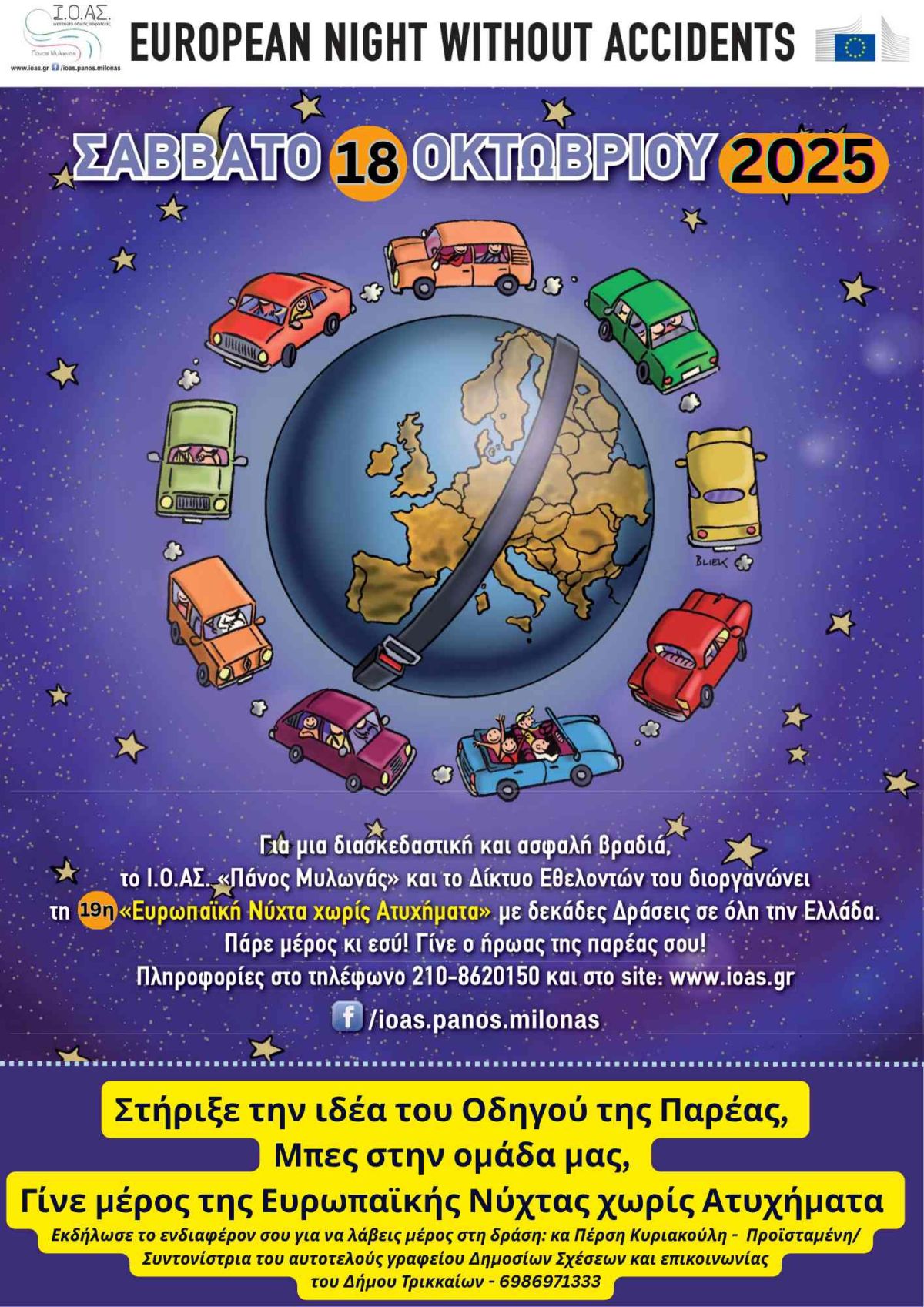 Ανοιχτό κάλεσμα σε εθελοντές/τριες για την «Ευρωπαϊκή Νύχτα Χωρίς Ατυχήματα» στα Τρίκαλα