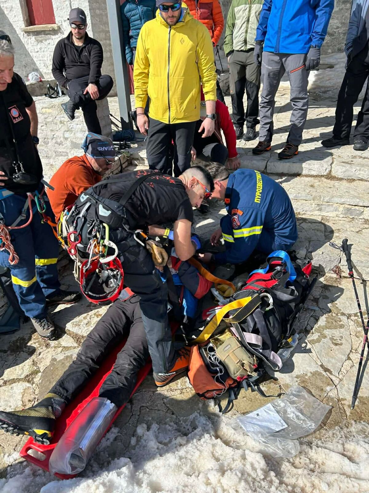 Αν και τα τραύματα του ορειβάτη –εμφανώς τουλάχιστον- δεν ήταν απειλητικά για τη ζωή του, αποφασίστηκε το αυτονόητο. Να μην υποβληθεί ο τραυματίας στην πολυώρη και εξαντλητική δοκιμασία της επίγειας μεταφοράς με φορείο από τα δύσβατα μονοπάτια.