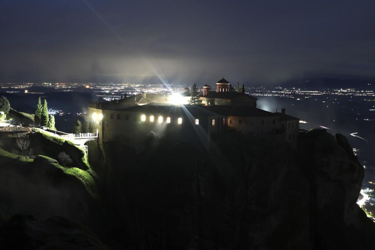 Ξεχωριστή στιγμή της ημέρας, η μοναδική φωτογραφία με φόντο τη Μονή Αγίου Στεφάνου λουσμένη στο μισοσκόταδο, ενώ στο βάθος απλώνεται φωτισμένη η περιοχή της Καλαμπάκας, συνθέτοντας μια εικόνα σπάνιας ομορφιάς και πνευματικής γαλήνης.