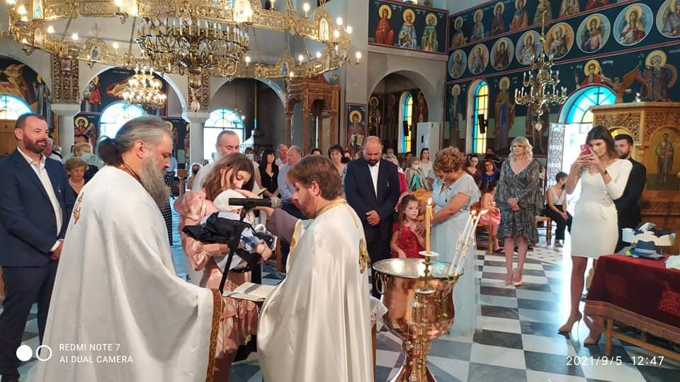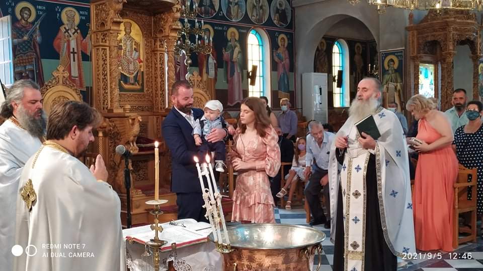 Νονα , η δεύτερη ξάδερφη του μικρού, Λαμπρινή Πλακιά. Το μυστήριο ετέλεσε ο Πανοσιολογιώτατος Αρχιμανδρίτης κ.Σωτήριος Ντάφης συμπαραστατούμενος από τους ιερείς του Ναού, θείος του νεοφωτίστου, ευγενώς προσκληθείς υπό της οικογενείας.