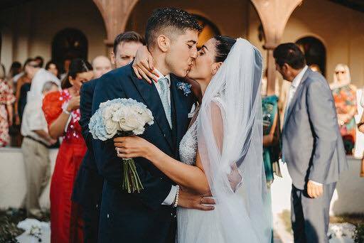 Η γαμήλια τελετή σχεδιάστηκε μέχρι την τελευταία της λεπτομέρεια από το νεαρό ζευγάρι και το αποτέλεσμα πραγματικά ενθουσίασε τους καλεσμένους. Στο γραφικό εκκλησάκι του Αγίου Νικολάου στα Λουτρά Χαλκιδικής δίπλα στη θάλασσα επέλεξαν να πραγματοποιηθεί το μυστήριο σε έναν υπέροχο χώρο στολισμένο με μπλε και λευκά λουλούδια. Κουμπάροι του ζευγαριού ήταν ο Νίκος Λαζαρίκος και η Μαριάννα Σανιδά.