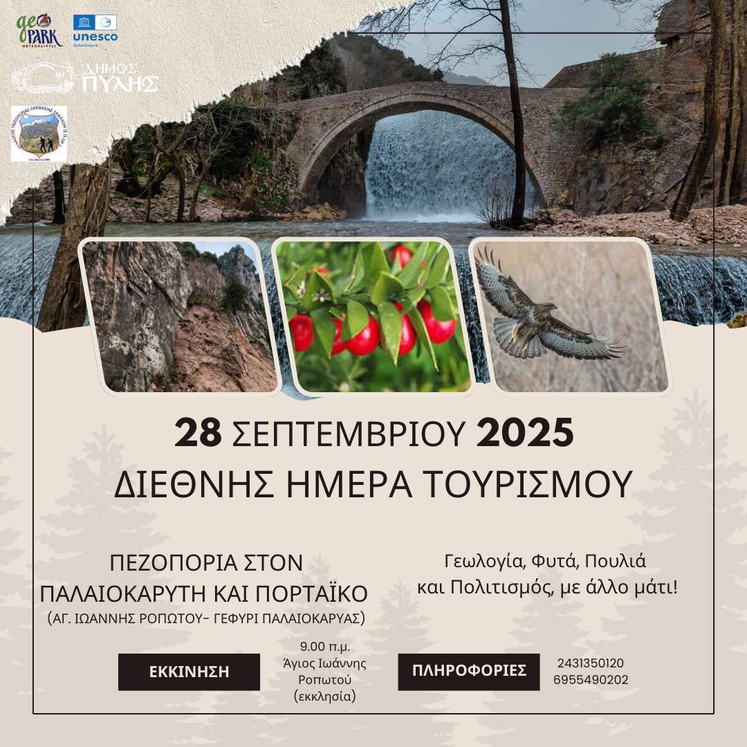 Ο Δήμος Πύλης (Αυτοτελές Τμήμα Τοπικής Οικονομικής Ανάπτυξης) και ο Σύλλογος Πεζοπορίας Ορειβασίας Τρικάλων (ΣΠΟΡΤ), σε συνεργασία με το Γεωπάρκο Μετεώρων – Πύλης γιορτάζουν τη Διεθνή Ημέρα Τουρισμού με μια “διαφορετική” πεζοπορία στον Παλαιοκαρύτη και το άνω τμήμα του Πορταϊκού Ποταμού, την Κυριακή 28 Σεπτεμβρίου 2025.