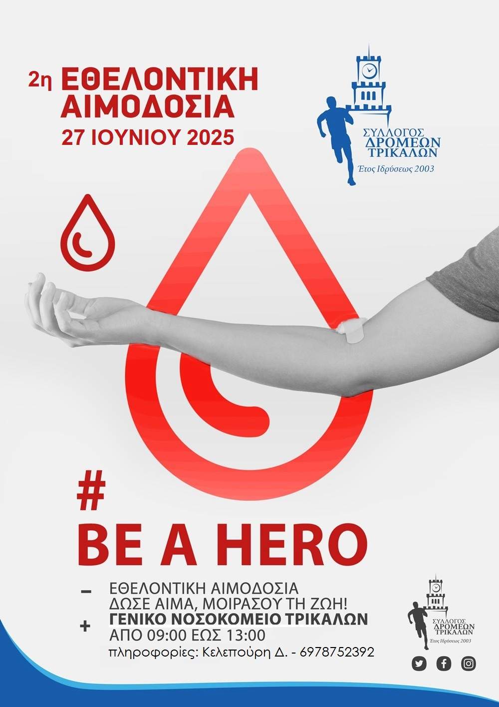 Το Δ.Σ. του Συλλόγου μας σε συνεργασία με το τμήμα αιμοδοσίας του Γενικού Νοσοκομείου Τρικάλων διοργανώνει την 2η εθελοντική αιμοδοσία από τα μέλη μας την Παρασκευή 27 Ιουνίου . Η αιμοδοσία θα γίνεται στο τμήμα αιμοδοσίας του Νοσοκομείου Τρικάλων από τις 9:00 έως τις 13:00.