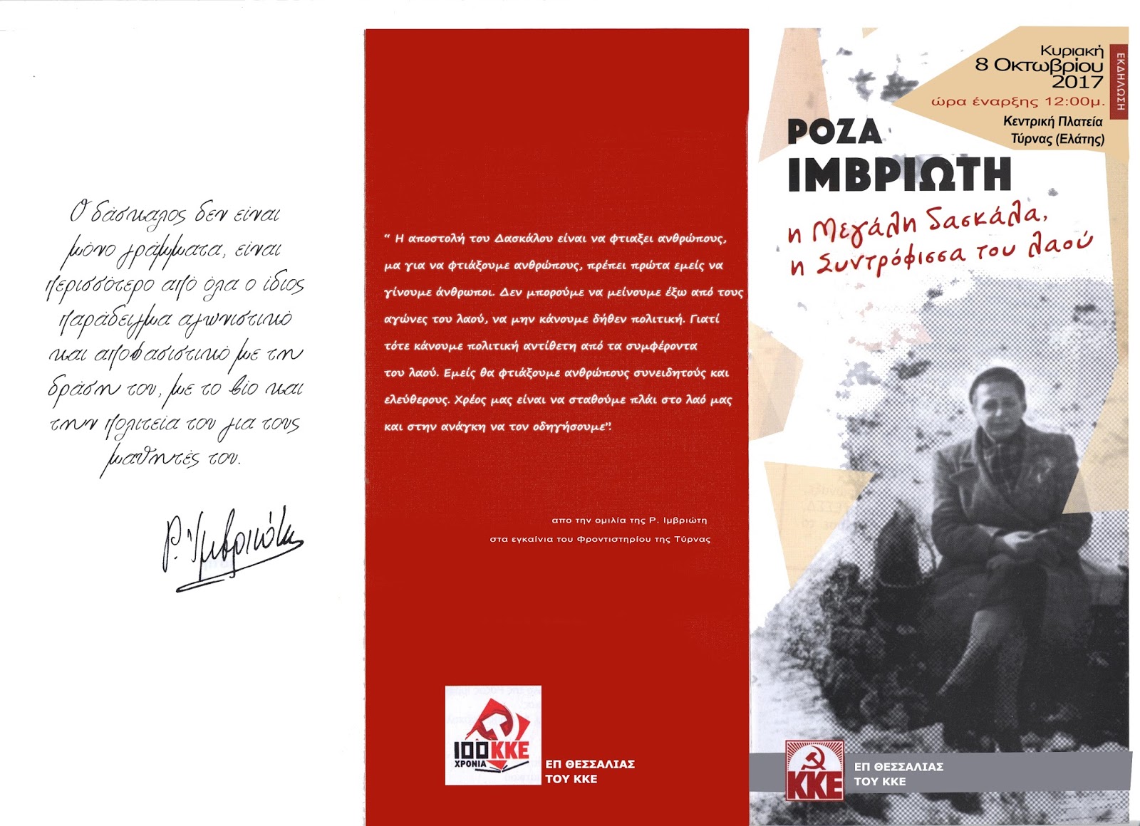 Η Επιτροπή Περιοχής Θεσσαλίας του ΚΚΕ διοργανώνει εκδήλωση στις 8 Οκτώβρη, στις 12μμ, στην κεντρική πλατεία της Τύρνας (Ελάτης) Τρικάλων, τιμώντας τη μεγάλη κομμουνίστρια παιδαγωγό Ρόζα Ιμβριώτη και ξεχωρίζοντας την ίδρυση του Παιδαγωγικού Φροντιστηρίου στην Τύρνα.