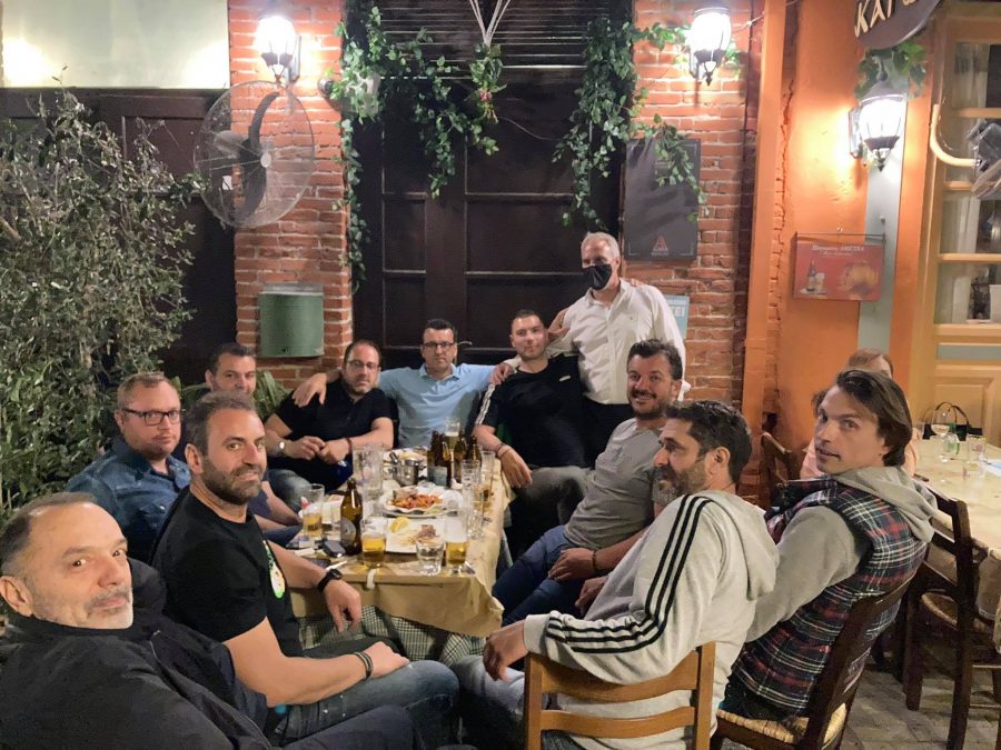 Είναι παρέα φίλων που καταφέρνει πάντα να κλέβει τα φώτα της δημοσιότητας τόσο στον αγωνιστικό χώρο μιας και μπαλαδόροι όσο και στην κοινωνική τους ζωή .Τα πρόσωπα της φωτό για τους περισσότερους Τρικαλινούς είναι  ιδιαίτερα γνωστά καθώς κάποια κατέχουν θέσεις κλειδιά στο δημόσιο και κάποια είναι φτασμένοι επιχειρηματίες …Η σύνθεση πάντως είναι μοναδική και καταγράφτηκε το περασμένο Σαββατοκύριακο στα Μανάβικα όπου υπό την γευστική εξυπηρέτηση του mister Κατώγι  Μπάμπη Σουφλάκη η γαστρονομική πανδαισία του μαγαζιού τιμήθηκε δεόντως από τα πρόσωπα της παρέας  ….Οι μάσκες έπεσαν  και για τις ανάγκες του φωτογραφικού φακού οι κύριοι  έγιναν αθλητική ομάδα για να τιμήσουν τα εδέσματα αλλά και να συζητήσουν παντός επιστητού για να κλείσει ευχάριστα, θυμίζοντας  βραδιά από τα παλιά ……