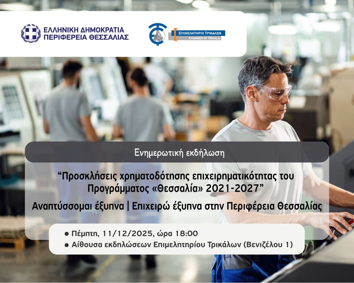 Το Επιμελητήριο Τρικάλων και η Περιφέρεια Θεσσαλίας σας προσκαλούν στην