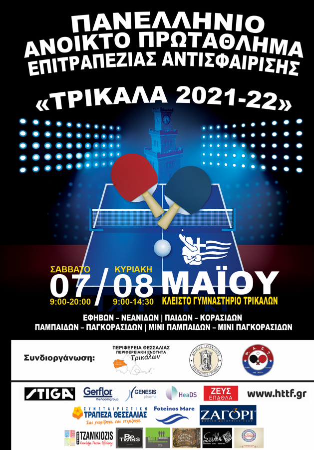Η πρώτη μεγάλη – πανελλήνιας εμβέλειας – αθλητική διοργάνωση μετά την πανδημία στα Τρίκαλα, αφορά στο πινγκ πονγκ ή επιτραπέζια αντισφαίριση. Πρόκειται για το Πανελλήνιο Ανοικτό Πρωτάθλημα Επιτραπέζιας Αντισφαίρισης για νέους/ες και παιδιά, που θα πραγματοποιηθεί το διήμερο 7 και 8 Μαΐου 2022 στο Δημοτικό Κλειστό Γυμναστήριο (έναντι 2ου Λυκείου).