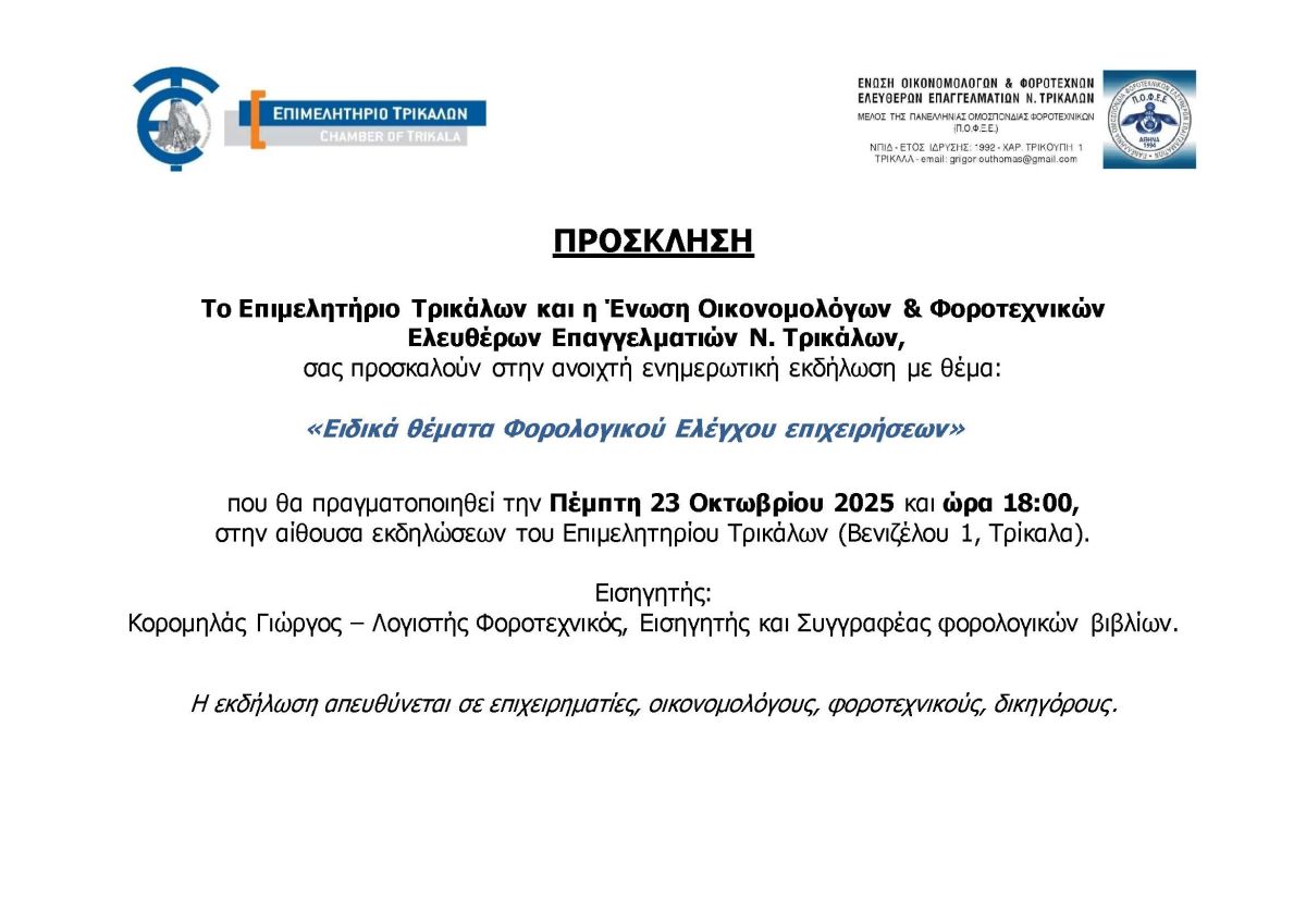 Το Επιμελητήριο Τρικάλων και η Ένωση Οικονομολόγων & Φοροτεχνικών Ελευθέρων Επαγγελματιών Ν. Τρικάλων, σας προσκαλούν στην ανοιχτή ενημερωτική εκδήλωση με θέμα: «Ειδικά θέματα Φορολογικού Ελέγχου επιχειρήσεων», που θα πραγματοποιηθεί την Πέμπτη 23 Οκτωβρίου 2025 και ώρα 18:00, στην αίθουσα εκδηλώσεων του Επιμελητηρίου Τρικάλων (Βενιζέλου 1, Τρίκαλα).