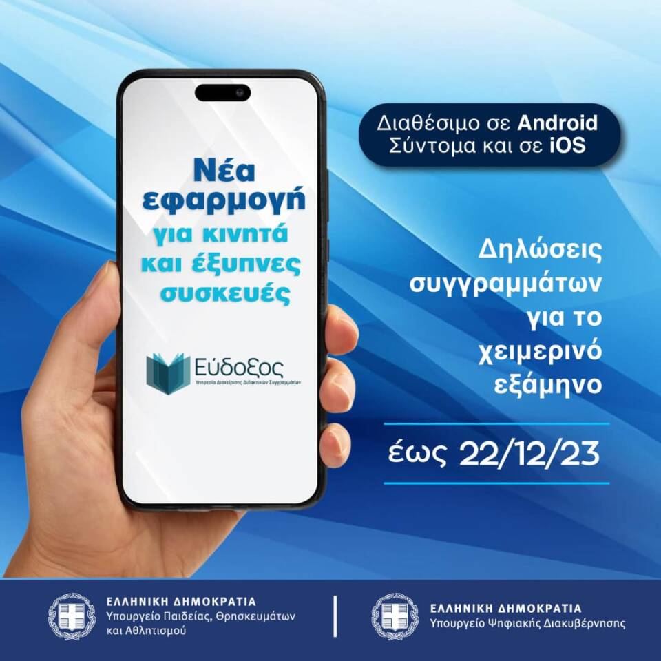 Τα Υπουργεία Παιδείας, Θρησκευμάτων και Αθλητισμού και Ψηφιακής Διακυβέρνησης ανακοινώνουν ότι είναι διαθέσιμη η νέα εφαρμογή (mobile app) «Εύδοξος». Μέσω της εφαρμογής, οι προπτυχιακοί φοιτητές μπορούν να ολοκληρώνουν τις διαδικασίες για τη δήλωση και παραλαβή των συγγραμμάτων, καθώς και να υποβάλουν ερωτήματα για διευκρινίσεις, διαθέτοντας έναν ευέλικτο τρόπο πρόσβασης στο πληροφοριακό σύστημα «Εύδοξος».