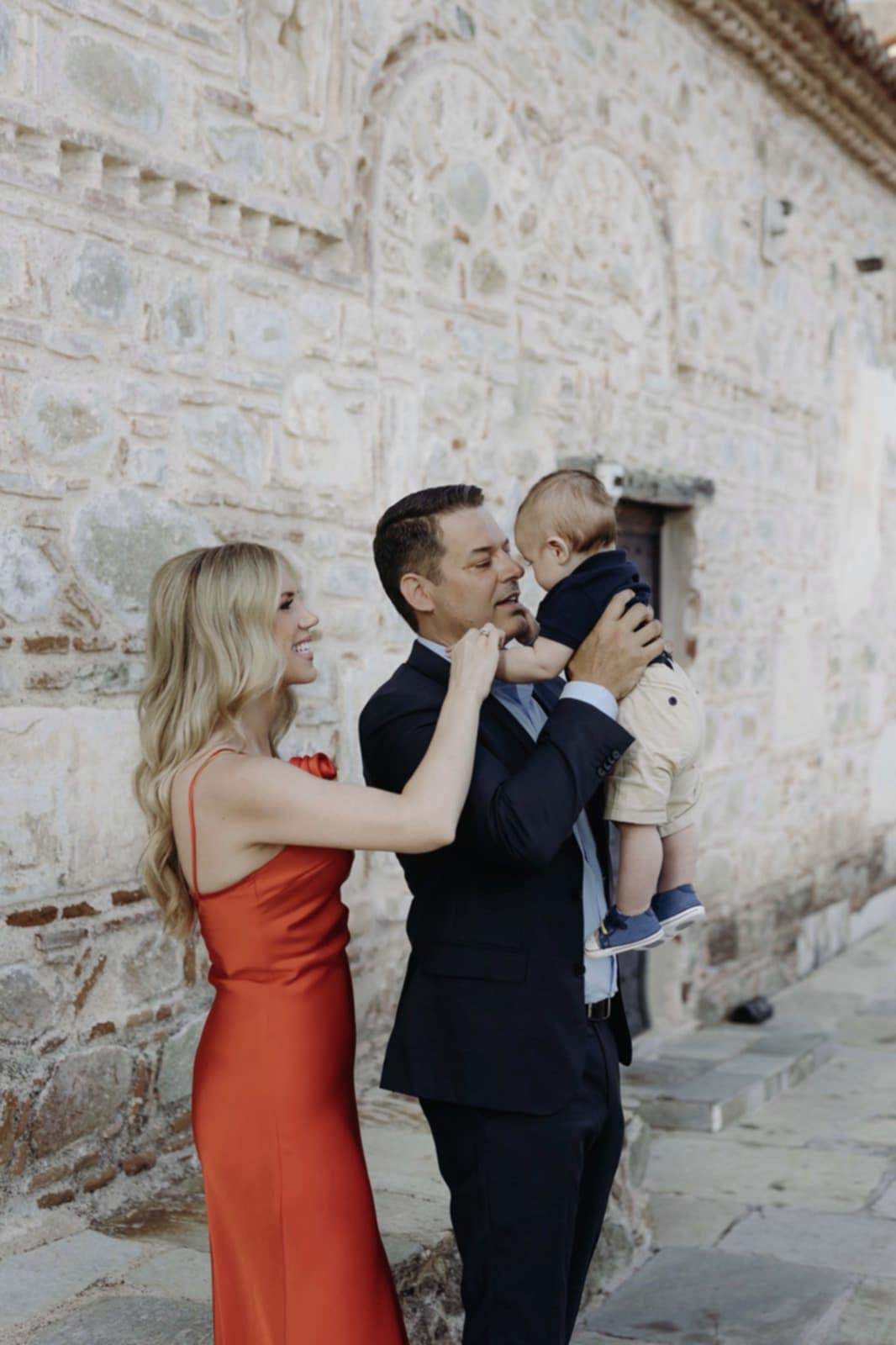 Κουμπάροι και νονοί, οι επιστήθιοι φίλοι του ζευγαριού, Ιάσωνας Μπακαλάκης και Ελένη Καρατζούνη, στάθηκαν στο πλευρό τους με αγάπη και χαμόγελα, χαρίζοντας στο νεοφώτιστο το όνομα ‘‘Χρήστος’‘. Μέσα σε μια ατμόσφαιρα καλοκαιρινής θαλπωρής, ήχους καμπανών και το απαλό αεράκι να δροσίζει την αυλή της εκκλησίας, οι ευχές όλων πλημμύρισαν τον μικρό Χρήστο, συνοδεύοντάς τον στο ξεκίνημα της ζωής του.