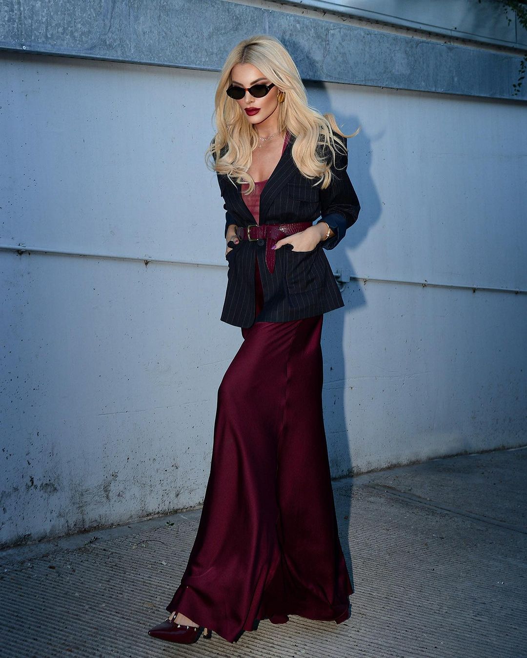 Συγκεκριμένα, η Κατερίνα Καινούργιου φορά μια ντελικάτη maxi σατέν φούστα στο απόλυτο χρώμα του χειμώνα, το βουργουνδί, η οποία χαρίζει πολυτέλεια και κίνηση στο look. Η παρουσιάστρια της εκπομπής «Super Κατερίνα» συνδύασε τη φούστα με ένα oversized blazers με λεπτή ρίγα και μια ζώνη από πάνω (επίσης βουργουνδί, η οποία ωστόσο είναι sold out), τονίζοντας έτσι τη μέση της.