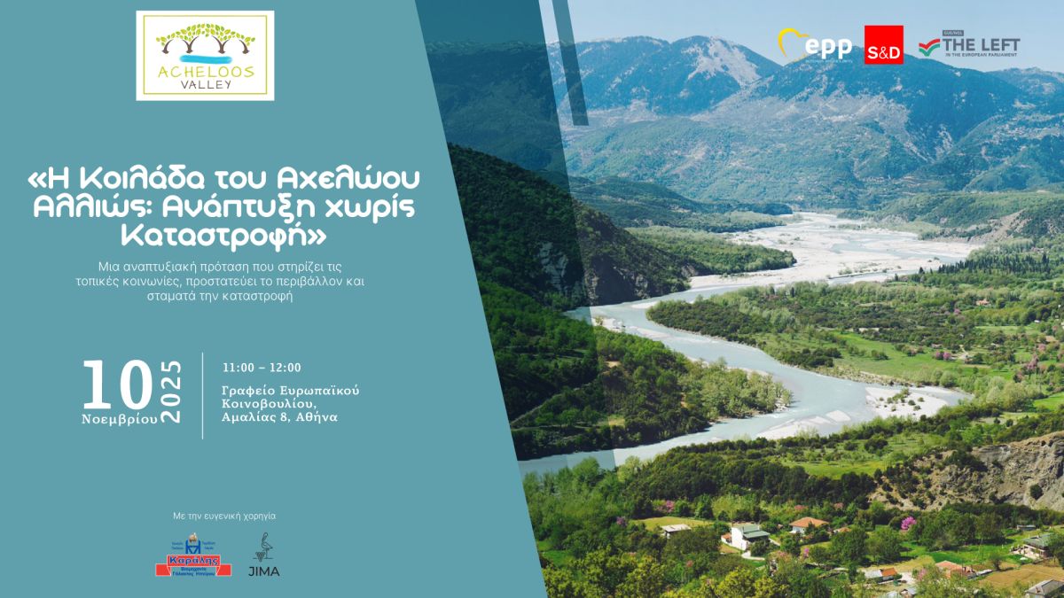 Μια νέα προοπτική για την ανάπτυξη της Κοιλάδας του Αχελώου αναδεικνύεται τη Δευτέρα 10 Νοεμβρίου 2025, στις 11:00, στο Γραφείο του Ευρωπαϊκού Κοινοβουλίου στην Ελλάδα (Λεωφ. Αμαλίας 8, Σύνταγμα), μέσα από την εκδήλωση με τίτλο: «Η Κοιλάδα του Αχελώου Αλλιώς: Ανάπτυξη χωρίς καταστροφή.» Μια πρωτοβουλία συνεργασίας Πολιτών, Θεσμών και Ευρώπης για το μέλλον της Ορεινής Υπαίθρου. Μια αναπτυξιακή πρόταση που στηρίζει τις τοπικές κοινωνίες, προστατεύει το περιβάλλον και σταματά την καταστροφή.