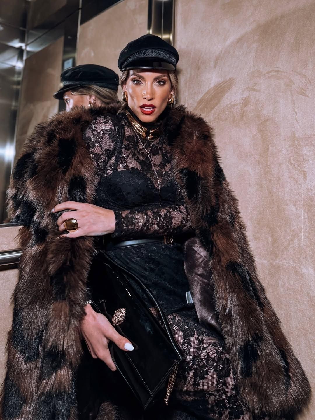 Το φόρεμα είναι εφαρμοστό και αναδεικνύει τη σιλουέτα, ενώ συνδυάζεται με ψηλές μαύρες μπότες, που κάνουν το σύνολο πιο ενιαίο και προσθέτουν ύψος και δυναμισμό. Πάνω από το φόρεμα φόρεσε μια εντυπωσιακή καφέ γούνα, η οποία προσθέτει πολυτέλεια και κάνει την εμφάνιση να δείχνει πιο ολοκληρωμένη, ειδικά για μια βραδινή έξοδο. Η αντίθεση ανάμεσα στο «γυμνό» φόρεμα και την πλούσια γούνα δίνει ισορροπία και κάνει το look πιο ενδιαφέρον.