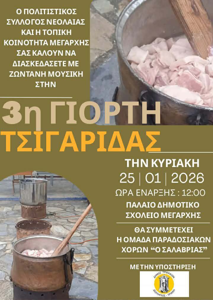 Στις 12:00 το μεσημέρι στο πρώην Δημοτικό Σχολείο του χωριού ο Πολιτιστικός Σύλλογος Νεολαίας και η Τοπική Κοινότητα Μεγάρχης με την στήριξη του Δ. Τρικκαίων θα αναβιώσουν το έθιμο της παραδοσιακής συνταγής χοιρινού. Μαζί με τις τσιγαρίδες σε όσους βρεθούν στην Γιορτή θα προσφέρεται κρασί και αναψυκτικά με τους ήχους ζωντανής μουσικής, ενώ θα συμμετέχει η Ομάδα Παραδοσιακών Χορών «Σαλαβριάς».