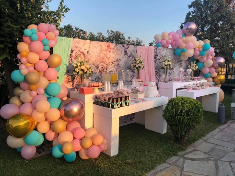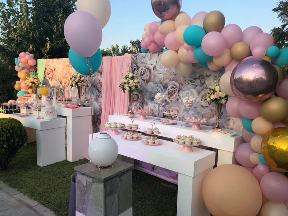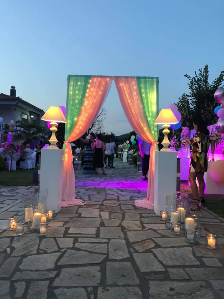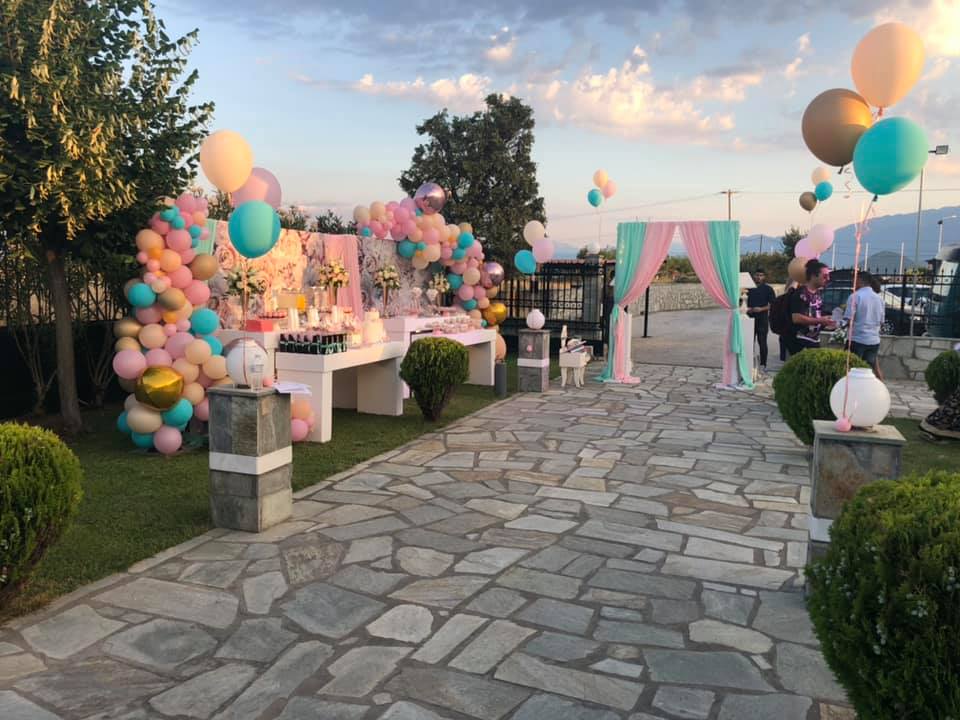 Για 3 ολόκληρες μέρες τα συνεργεία και η ομάδα του GLAMOUR, στήνανε τις ειδικές κατασκευές στον χώρο της δεξίωσης αλλά και της εκκλησίας. Λευκές τραπεζαρίες με floral φόντο, συνθέσεις με λουλούδια, αμέτρητη ποικιλία γλυκών, φωτισμοί led σε διάφορες αποχρώσεις, ειδικές κατασκευές με φωτισμούς Led και τεράστιες συνθέσεις μπαλονιών, συνθέσανε ένα παραμυθένιο σκηνικό διακόσμησης που δεν αντικρίζεις συχνά. Σχεδόν 300 καλεσμένοι, δώσανε το παρόν στην δεξίωση που πραγματοποιήθηκε στο κτήμα της οικογενείας, όλοι τους μαγεμένοι από την αισθητική του χώρου.