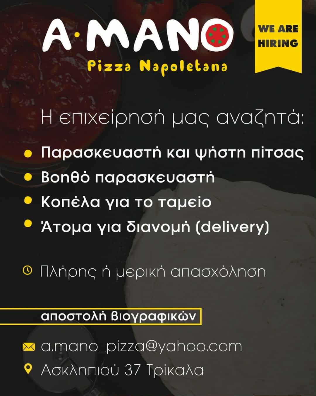 Νέα αγγελία με θέσεις εργασίας στην A-MANO Pizza Napoletana στα Τρίκαλα —στην διεύθυνση  (Ασκληπιού 37).