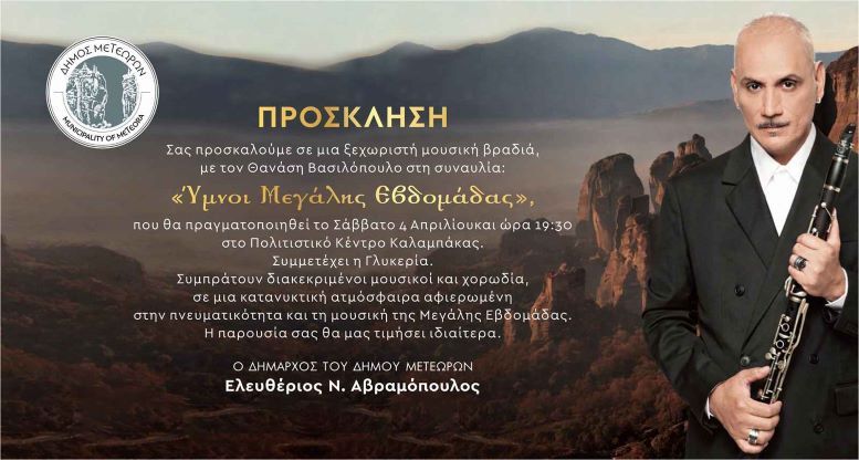 Ο Δήμος Μετεώρων προσκαλεί το κοινό σε μια ξεχωριστή μουσική βραδιά αφιερωμένη στο πνεύμα της Μεγάλης Εβδομάδας, το Σάββατο 4 Απριλίου και ώρα 19:30, στο Πολιτιστικό Κέντρο Καλαμπάκας. Στη συναυλία με τίτλο «Ύμνοι Μεγάλης Εβδομάδας», ο βιρτουόζος του κλαρίνου Θανάσης Βασιλόπουλος θα παρουσιάσει ένα κατανυκτικό πρόγραμμα με ύμνους και μελωδίες που αποτυπώνουν τη βαθιά συγκίνηση και τη μυσταγωγία των ημερών του Πάσχα.