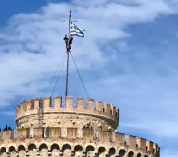 Όπως φαίνεται στο βίντεο, δυο άτομα νεαρής ηλικίας, σκαρφάλωσαν στον ιστό της ελληνικής σημαίας που βρίσκεται στην κορυφή του Λευκού Πύργου και τραβούν βίντεο.