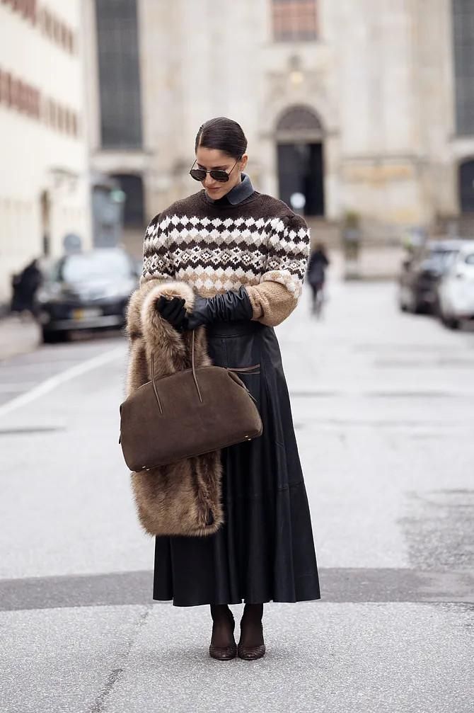 Ξεχωρίσαμε στους δρόμους του Παρισιού αυτό το σύνολο με αλπικό πουλόβερ σε καφέ τόνους, φούστα στο χρώμα του καφέ, εσάρπα και δερμάτινα γάντια. Ένα πολυσυλλεκτικό mix τάσεων που, χάρη στην ουδετερότητα των χρωμάτων, «δένει» άψογα.