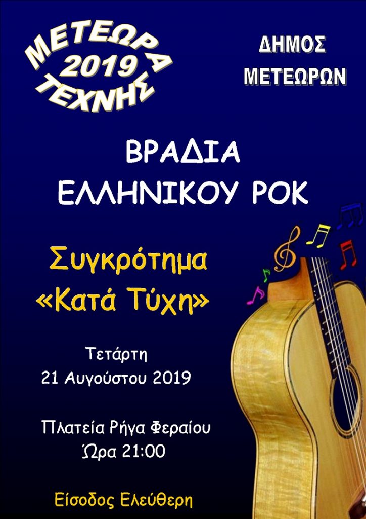 Σας περιμένουμε όλους στην καρδιά της πόλης,στην Πλατεία Ρήγα Φεραίου, κάτω από τους επιβλητικούς βράχους των Μετεώρων, να τραγουδήσουμε μαζί με το συγκρότημα «Κατά Τύχη», αξέχαστες επιτυχίες καταξιωμένων τραγουδιστών της ελληνικής ΡΟΚ μουσικής σκηνής.