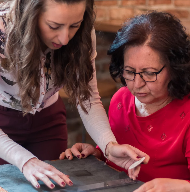 Η σχεδιάστρια μόδας Βασιλική Θεοδώρου με τη μητέρα της που της έμαθε να πλέκει, στο ατελιέ του fashion brand Miss Polyplexi