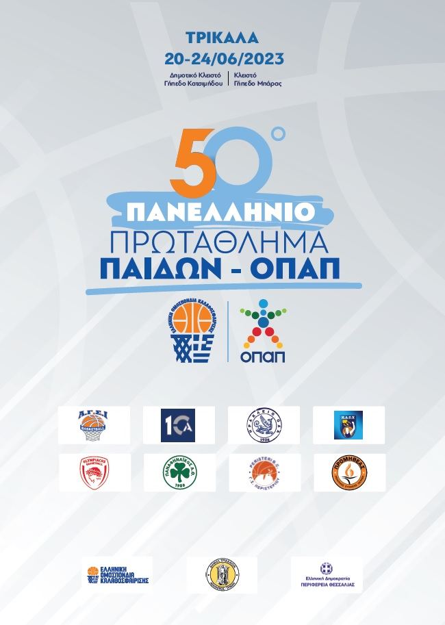 Ξεκινά αύριο Τρίτη στην πόλη των Τρικάλων το “Final 8” του 50ου Πανελλήνιου ΠρωταθλήματοςΠαίδων ΟΠΑΠ. Οι αγώνες θα διεξαχθούνκαι στα δύο του Κλειστά Γυμναστήρια, τοΔημοτικό Κλειστό (επί της οδού Κατσιμήδου) και το Κλειστό στο Δημοτικό Αθλητικό Κέντρο (στην περιοχή της Μπάρας).Στους αγώνες συμμετέχουν οι εξής 8 ομάδες: Προμηθέας Πατρών,Παναθηναϊκός, Ηράκλειο, Ευρώπη 87, ΔΕΚΑ, ΓΣ Περιστερίου, ΟλυμπιακόςΠειραιά, ΑΓΣ Ιωαννίνων.