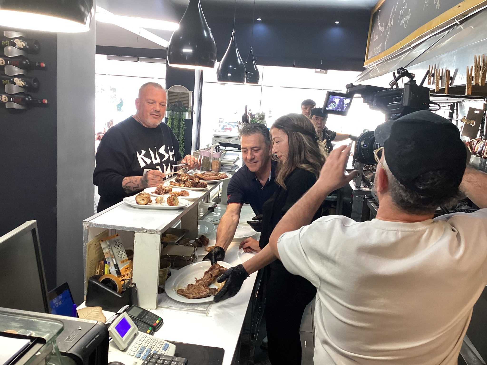 Μαζί με τον σεφ Δημήτρη Σκαρμούτσο που βρέθηκε στα Τρίκαλα για τα γυρίσματα της τηλεοπτικής εκπομπής «γειτονιές στο πιάτο» βρέθηκαν, ο ιδιοκτήτης του Κεμπακάδικου ”Οι Χασάπηδες”, Πέτρος Γρηγορίου & η Ελένα Αλεξοπούλου ετοιμάζοντας μια άκρως γευστική…εκπομπή. Ο γνωστός σεφ επισκέφτηκε την πόλη μας…και μέσα από την εκπομπή του θα μεταφέρει τις γεύσεις και τα μυστικά του κεμπάπ αλλά και όλων των ψητών και εδεσμάτων του γνωστού Κεμπακάδικου ”Οι Χασάπηδες”.