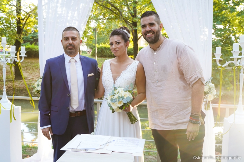 Οι κουμπάροι Κωνσταντίνος Μπουνόβας και Νανά Στεφάνου. Το μυστήριο του πολιτικού γάμου τέλεσε ο αντιδήμαρχος Γιώργος Καταβούτας, με θέα το ποτάμι και την υπέροχη συνοδεία σαξοφώνου..και βιολοντσέλου που εξέπληξε ευχάριστα τους καλεσμένους.