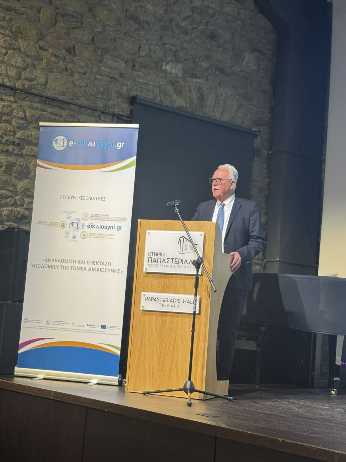 Στην αίθουσα Παπαστεριάδη του Δήμου Τρικκαίων, παρουσία ενός ακροατηρίου που αποτελούνταν κυρίως από νομικούς, ο Υπουργός Ψηφιακής Διακυβέρνησης Δημήτρης Παπαστεργίου παρουσίασε τις νέες πρωτοβουλίες για τον ψηφιακό μετασχηματισμό της Δικαιοσύνης.ενώ χαιρετισμό απηύθυναν εκ μέρους του Δήμου Τρικκαίων η δικηγόρος και δημοτική σύμβουλος Μαρίνα Καραμέτου και εκ μέρους του Δικηγορικού Συλλόγου Τρικάλων ο πρόεδρος Νίκος Γουγουλάκης.
