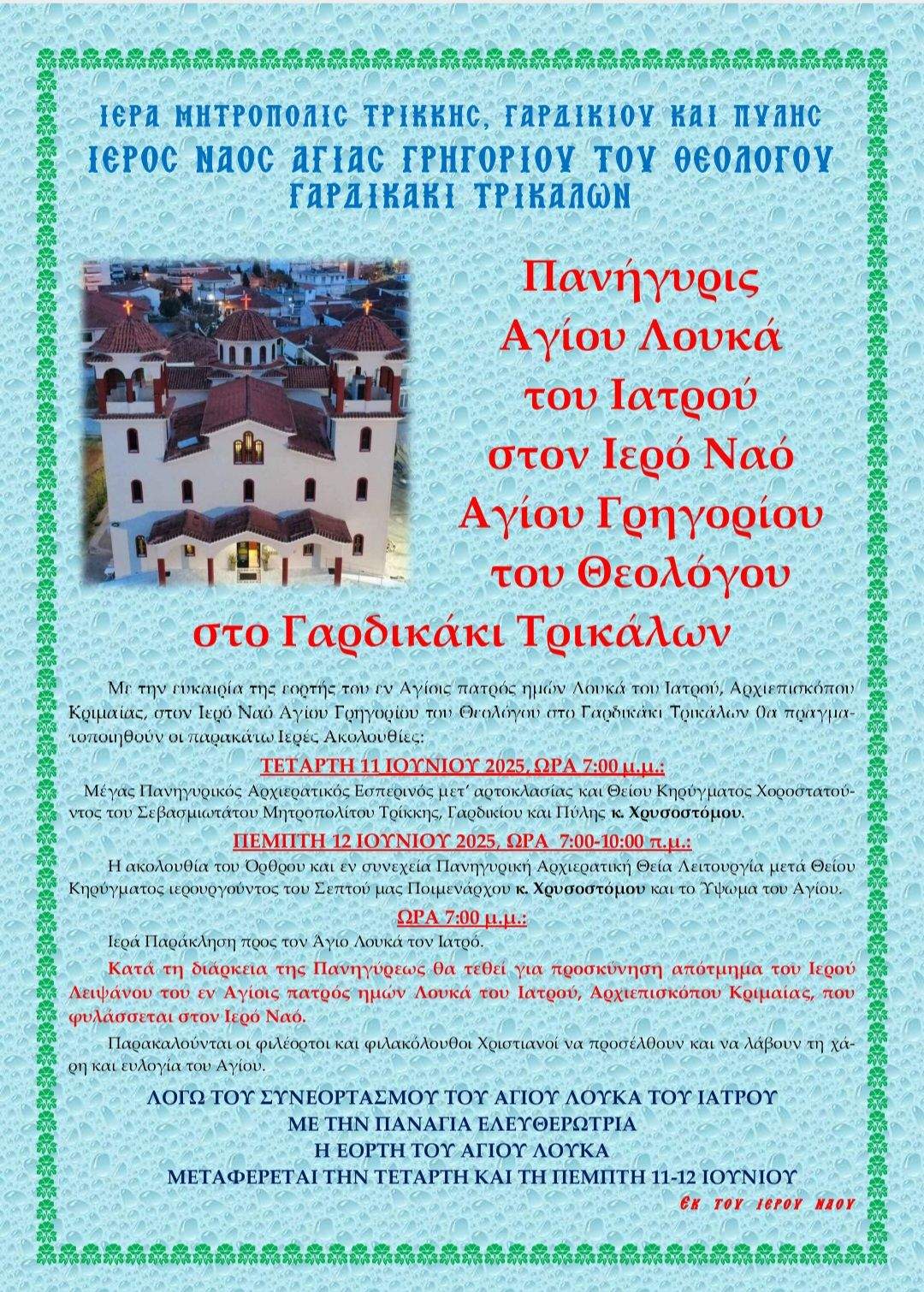 Στο Γαρδικάκι, η εκκλησία του Αγ.Γρηγορίου γιορτάζει με λαμπρότητα την ημέρα αυτή. Οι πιστοί  συγκεντρώνονται για να τιμήσουν τον Άγιο Λουκά, συμμετέχοντας στη Θεία Λειτουργία και στις εορταστικές εκδηλώσεις. Η ατμόσφαιρα είναι κατανυκτική και γεμάτη χαρά, με τους πιστούς να εκφράζουν την ευλάβειά τους και να αναζητούν την πνευματική ενίσχυση.