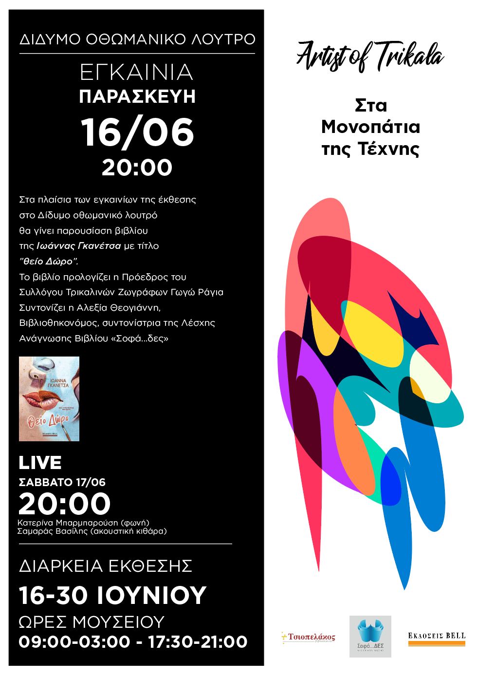 Οι Εκδόσεις BELL, ο Σύλλογος Τρικαλινών Ζωγράφων, η Λέσχη Ανάγνωσης Βιβλίου «Σοφά…δες» και το βιβλιοπωλείο Τσοπελάκος, στο πλαίσιο των εγκαινίων της έκθεσης «Στα Μονοπάτια της Τέχνης» του Συλλόγου Τρικαλινών Ζωγράφων, σας προσκαλούν στην παρουσίαση του μυθιστορήματος της Ιωάννας Γκανέτσα, Θείο Δώρο, την Παρασκευή 16 Ιουνίου 2023, στις 20:00, στην αίθουσα «Δίδυμο Οθωμανικό Λουτρό», στο ισόγειο του Μουσείου Τσιτσάνη (Βενιζέλου και Καρδίτσης 1, Τρίκαλα).
