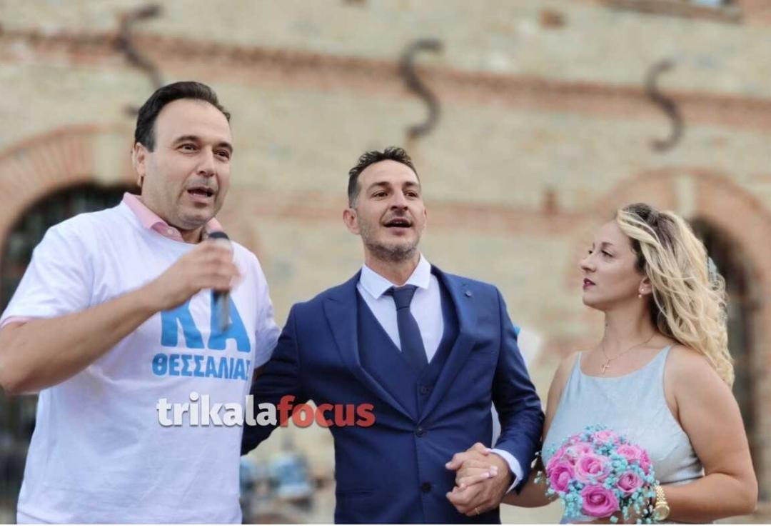 Ο Τρικαλινός επιχειρηματίας ελαστικών και η όμορφη ραδιοφωνική παραγωγός αποδέχτηκαν την πρόταση του Δημήτρη Παπαστεργίου να ενωθούν με τα δεσμά του πολιτικού γάμου στη διάρκεια της 2ης Πανελλήνιας Συνάντησης Διδύμων και Διδύμων, χαρίζοντας μια ξεχωριστή νότα στην διοργάνωση που στέφθηκε με επιτυχία.