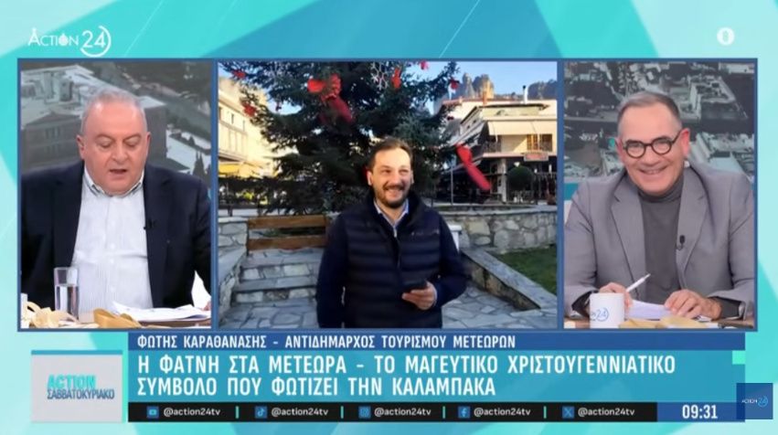 Ο Αντιδήμαρχος Τουρισμού του Δήμου Μετεώρων, Φώτης Καραθανάσης, μίλησε το πρωί στην εκπομπή «Action Σαββατοκύριακο» του Action 24, με τους δημοσιογράφους Δημήτρη Καμπουράκη και Βαγγέλη Γιακουμή, αναφερόμενος στη μοναδική φάτνη που τοποθετήθηκε στους βράχους των Μετεώρων και έχει προκαλέσει έντονο πανελλαδικό ενδιαφέρον. Όπως σημείωσε, πρόκειται για μια πρωτοβουλία με ισχυρό συμβολισμό, που αναδεικνύει τον ιδιαίτερο χαρακτήρα της περιοχής και ενισχύει την τουριστική της προβολή. Παράλληλα, μίλησε για την αυξημένη τουριστική κίνηση, τονίζοντας ότι οι κρατήσεις βρίσκονται ήδη σε πολύ καλά επίπεδα και αναμένεται περαιτέρω άνοδος τις επόμενες ημέρες. Δεν παρέλειψε να αναφερθεί στα προβλήματα που έχουν δημιουργηθεί από τα αγροτικά μπλόκα, εκφράζοντας τη στήριξή του στα δίκαια αιτήματα των αγροτών και καλώντας την Κυβέρνηση να δώσει άμεσες λύσεις. Κλείνοντας, υπογράμμισε ότι η Καλαμπάκα είναι γιορτινά στολισμένη και έτοιμη να υποδεχθεί τους επισκέπτες κάτω από τους εντυπωσιακούς βράχους των Μετεώρων.