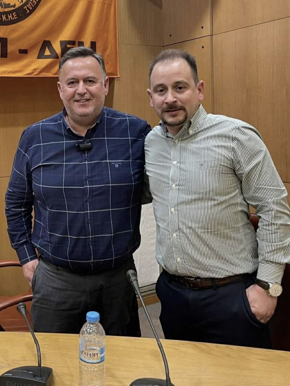 Στη φωτογραφία, ο κ. Μανασής εμφανίζεται μαζί με τον συντοπίτη του και Πρόεδρο του Πανελλήνιου Σωματείου Εργαζομένων της ΔΕΗ, κ. Στέφανο Κουνουκλά, γεγονός που υπογραμμίζει τη στενή συνεργασία του Σωματείου Τρικάλων με το εθνικό επίπεδο και τη σημασία της εκπροσώπησης των εργαζομένων σε κεντρικό συνδικαλιστικό επίπεδο.