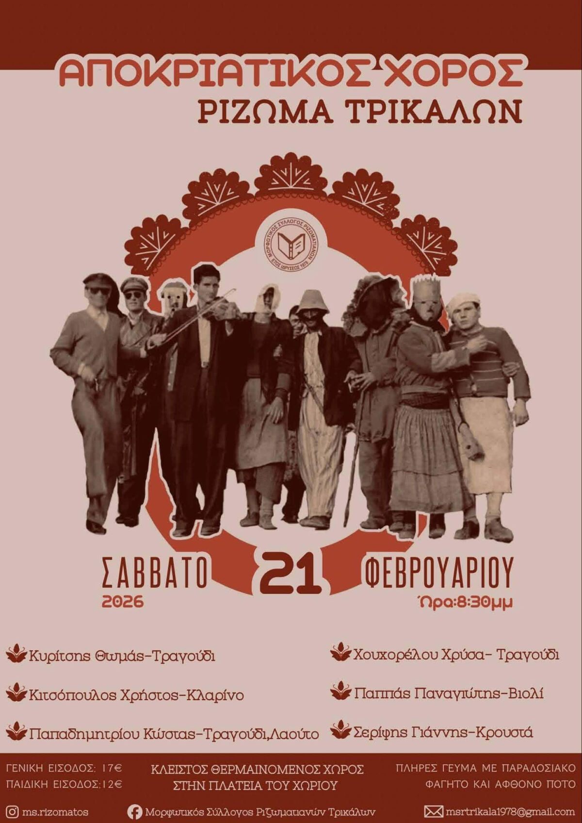 Ο Μορφωτικός Σύλλογος Ριζωματιανών Τρικάλων σας προσκαλεί στον παραδοσιακό Αποκριάτικο Χορό που διοργανώνει το Σάββατο 21 Φεβρουαρίου 2026, για μια βραδιά γεμάτη κέφι, παράδοση και ζωντανή μουσική. Η εκδήλωση θα πραγματοποιηθεί στον κλειστό θερμαινόμενο χώρο στην πλατεία του χωριού, με ώρα έναρξης τις 8:30 μ.μ.