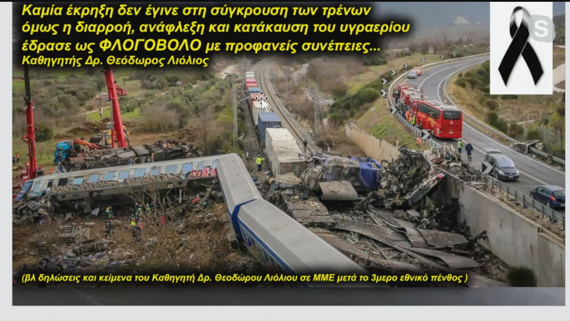 Μιλώντας στην εκπομπή Alpha Ενημέρωση ο Καθηγητής Πυρηνικής Φυσικής και Οπλικών Επιστημών Θεόδωρος Λιόλιος επισημαίνει ότι δεν συνδέεται με κανέναν τρόπο με οποιονδήποτε από τους εμπλεκόμενους και εξηγεί τι συνέβη στο μοιραίο τρένο με προσομοίωση της ανάφλεξης και έκρηξης με τη χρήση λογισμικού.