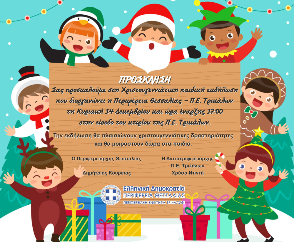 Η Περιφέρεια Θεσσαλίας – Π.Ε. Τρικάλων σας προσκαλεί στη Χριστουγεννιάτικη παιδική εκδήλωση που θα πραγματοποιηθεί την Κυριακή 14/12/2025 και ώρα 17:00 μ.μ. στην είσοδο του κτιρίου της Π.Ε. Τρικάλων.