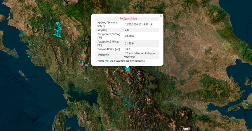 Σεισμική δόνηση σημειώθηκε λίγο μετά τις 12:18 το μεσημέρι της Πέμπτης, με επίκεντρο την περιοχή των Αγράφων, κοντά στην Καρδίτσα. Σύμφωνα με τις πρώτες εκτιμήσεις των σεισμολογικών σταθμών, το μέγεθος του σεισμού υπολογίζεται στα 4,8 Ρίχτερ.