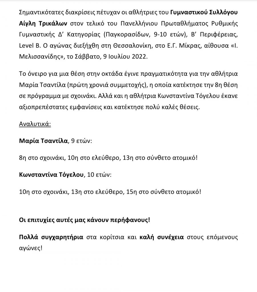Idees Sports Σημαντικές διακρίσεις του Γυμναστικού συλλόγου Αίγλη Τρικάλων 14/07/2022 Less than a minute Facebook X 14/07/2022 Less than a minute Facebook X Follow Us Share Facebook X Viber