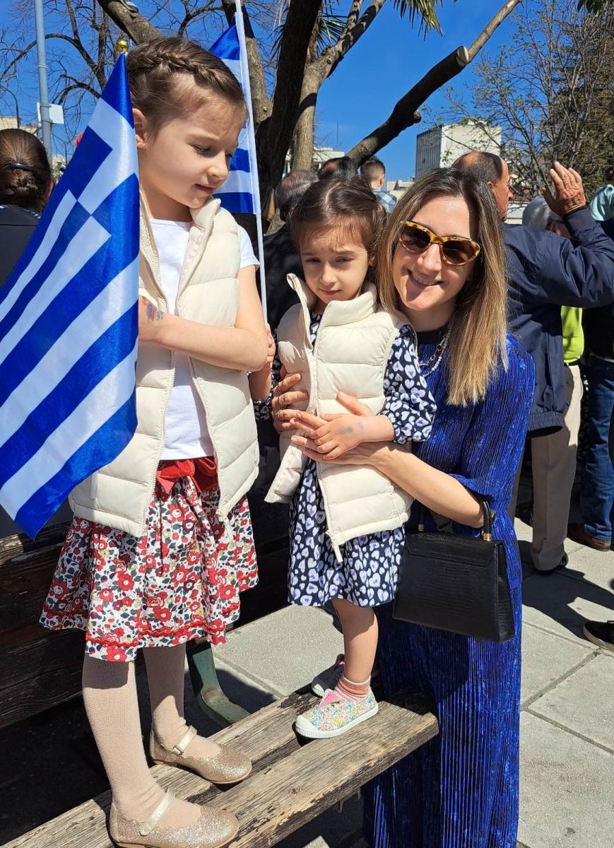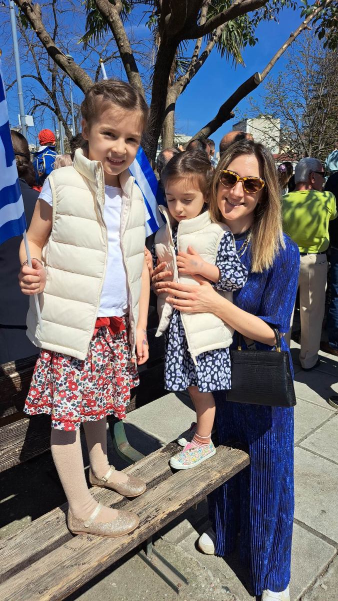 H Aγγελική Χατζηγάκη, στα μπλε μαζί με τις κόρες της παρακολούθησαν την παρέλαση της 25ης Μαρτίου στα Τρίκαλα σε μια ηλιόλουστη μέρα. Μαμά και κόρες χειροκρότησαν τη μαθητική νεολαία της πόλης και απόλαυσαν τη βόλτα τους.