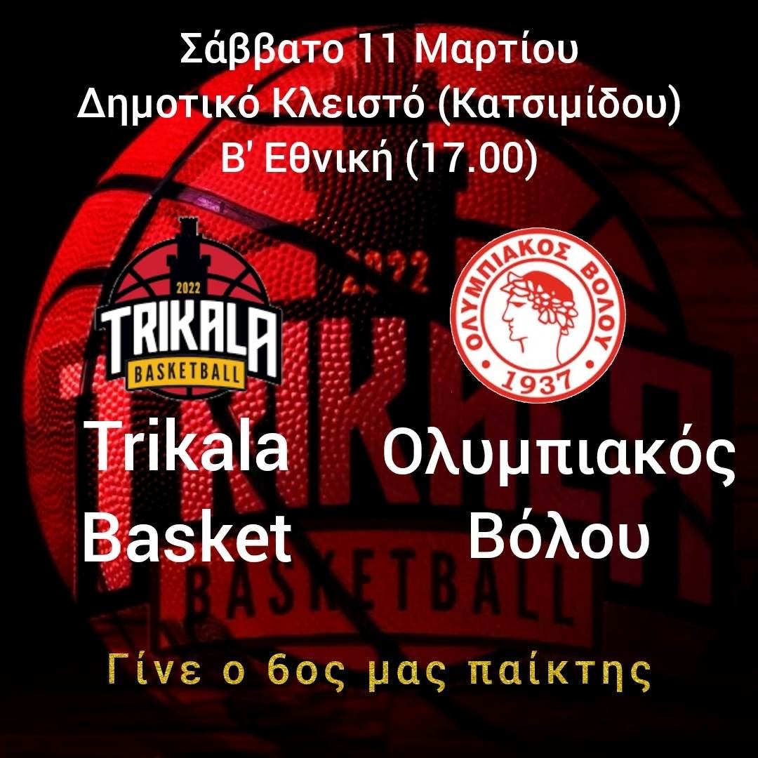 Επιστρέφουν στην έδρα τους τα Trikala Basket που σήμερα Σάββατο στις 17.00 υποδέχονται τον Ολυμπιακό Βόλου μπαίνοντας στην τελική ευθεία για την ολοκλήρωση της κανονικής διάρκειας του πρωταθλήματος της Β’Εθνικης.Η νίκη είναι απαραίτητη για την τρικαλινή ομάδα έτσι ώστε να παραμείνει στις θέσεις που οδηγούν στα πλέι οφ ανόδου για την Α2.
