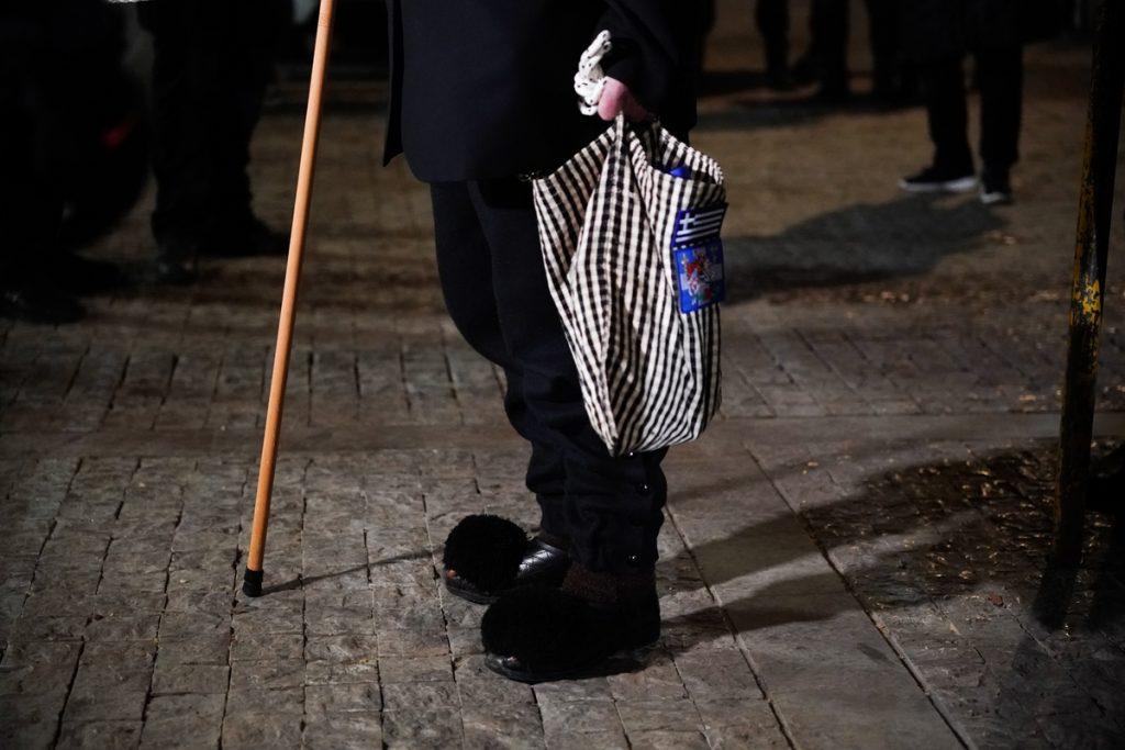 Μία τέτοια φαίνεται στις φωτογραφίες. Ενας συμπαθής ηλικιωμένος, στην ουρά, φοράει τσαρούχια μαύρα, κρατά ένα μπαστούνι και μια καρό τσάντα στην οποία υπάρχει η ελληνική σημαία και μια εικόνα του Αγίου Γεωργίου.